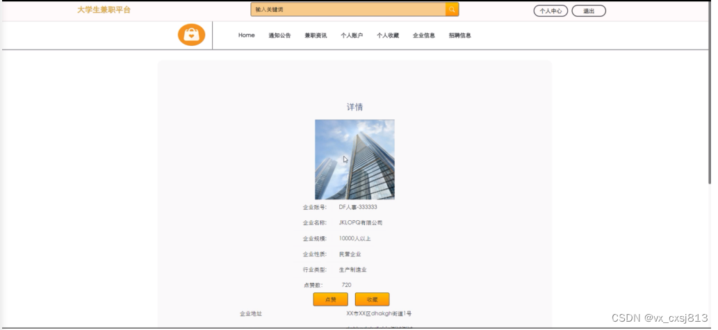 企业信息,在该页面可以通过搜索关键字或排序进行查看各个企业的详细信息,如:企业账户、企业名称、企业规模、企业性质、行业类型、点赞数、企业地址、企业简介等信息,可进行点赞、收藏、发表评论等操作,如图5-17 5-18所示。