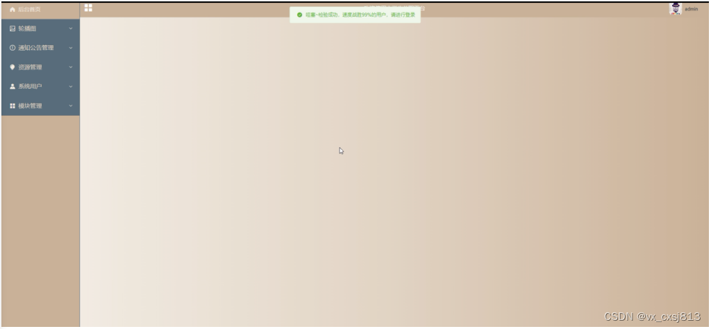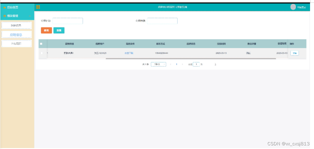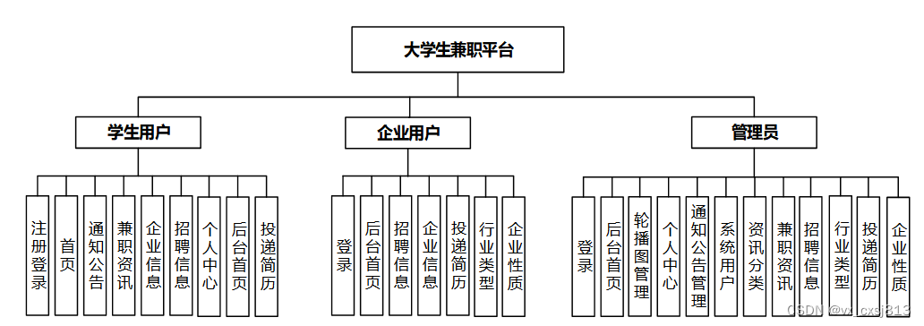 (1)功能要求:后台首页、个人中心、轮播图管理、通知公告管理、资源管理(兼职资讯、资讯分类)、系统用户(管理员、学生用户、企业用户)、模块管理(企业信息、招聘信息、企业性质、投递简历、行业类型)等功能模块。
