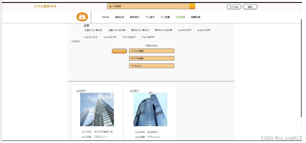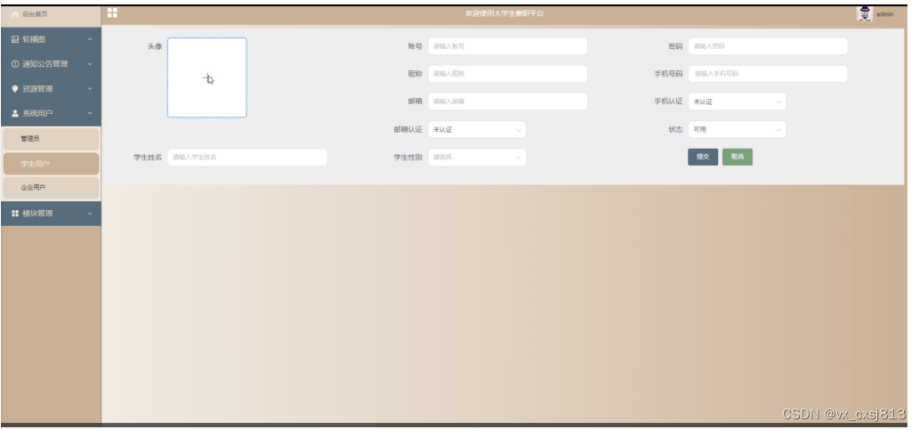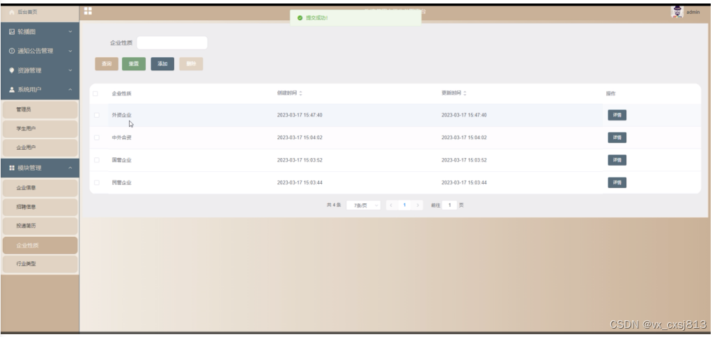3、功能的完善性:拥有后台首页、个人中心、轮播图管理、通知公告管理、资源管理(兼职资讯、资讯分类)、系统用户(管理员、学生用户、企业用户)、模块管理(企业信息、招聘信息、企业性质、投递简历、行业类型)等功能的修改维护操作。