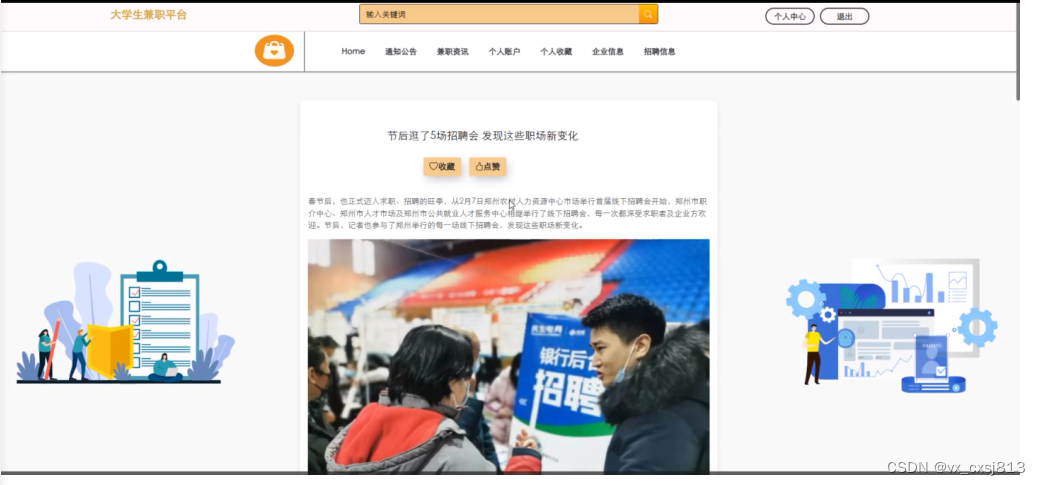 兼职资讯,在该页面可以通过局部搜索、筛选或排序进行查看管理员发布的兼职资讯信息,对自己喜欢的资讯可进行点赞、收藏、评论等操作,如图5-19 5-20所示。
