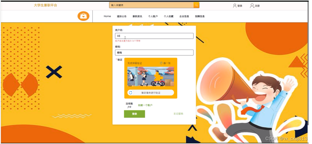 注册用户登录大学生兼职平台,需先注册,注册成功后在登录页面输入用户名、密码进行登录,如图5-12,5-13所示。