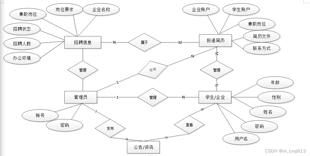 通过大学生兼职平台的功能进行规划分成几个实体信息,实体信息将通过ER图进行说明,本系统的主要实体图如下: