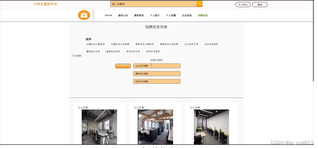 招聘信息,在该页面可以通过搜索关键字或排序进行查看各个招聘公司的详细信息,如:企业账户、企业名称、兼职岗位、招聘状态、招聘人数、发布时间、点赞数、岗位要求、工作描述、薪资说明等信息,可进行点赞、收藏、发表评论或投递简历等操作,如图5-15 5-16所示。