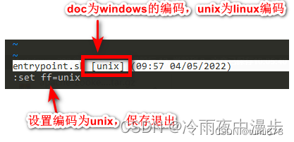 使用cmder或git bash工具用vim打开启动脚本entrypoint.sh,设置文件编码格式set ff=unix。原文链接:https://blog.csdn.net/Numb_ZL/article/details/124566468。但是由于启动脚本entrypoint.sh实在Windows环境下编写的,文件编码方式不是unix,所以无法执行。在Dockerfile中使用了启动脚本e