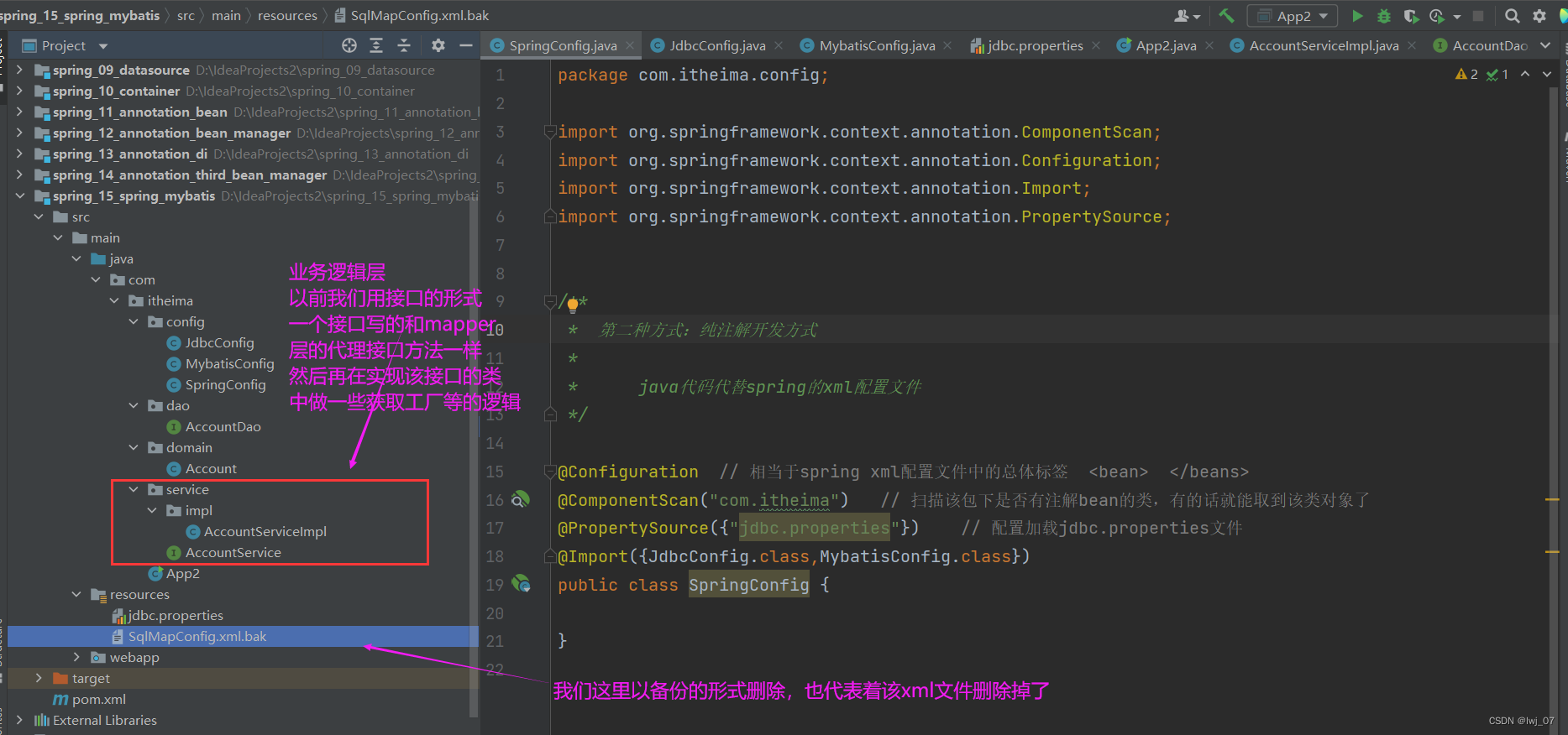 新增知识点2当dao/mapper层的代理接口全是通过注解的形式来进行对数据库的增删改查等一些操作的时候,那么我们就可以不再写AccountDao.xml代理接口文件了(在核心配置文件中加载sql映射文件的地方直接加载dao层里的AccountDao类即可访问到该类了,以前我们都是加载到AccountDao.xml)那么你可能会问为什么业务逻辑层的接口和mapper接口代码一样的话,不直接让实现业