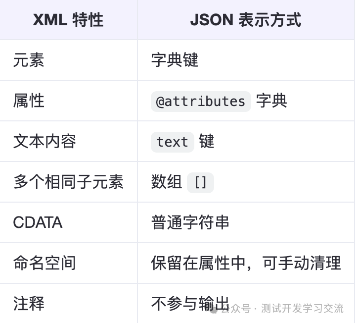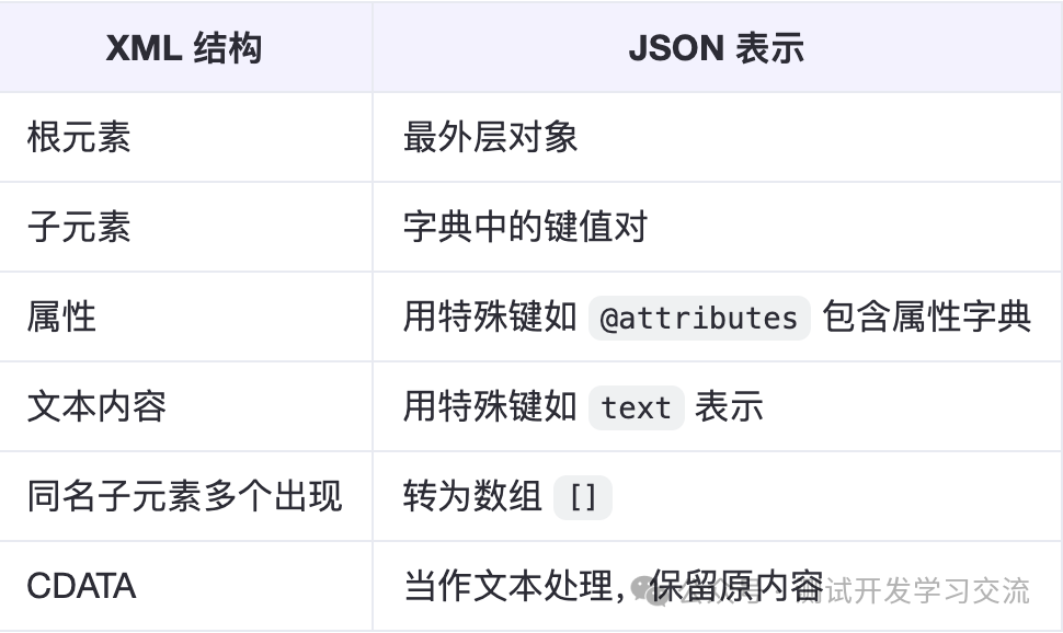 在使用 Python 的 xml.etree.ElementTree 解析后,我们将每个 XML 元素递归地转换为字典,最终整个结构变成一个 JSON 对象。以下是通用的转换规则: