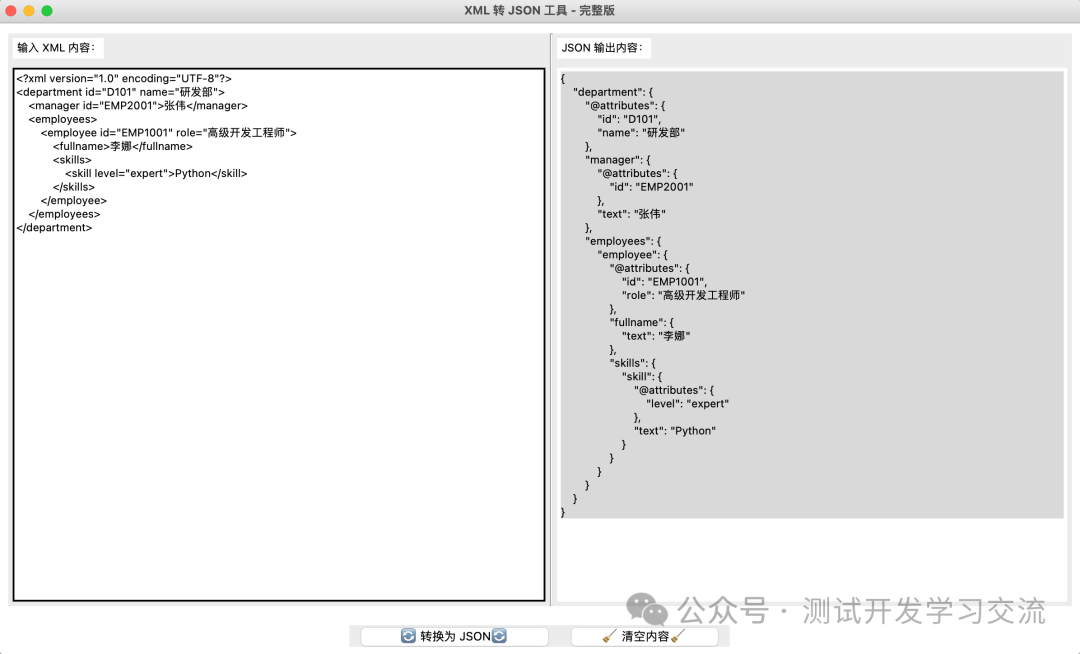 左右布局:清晰地展示输入(XML)和输出(JSON)