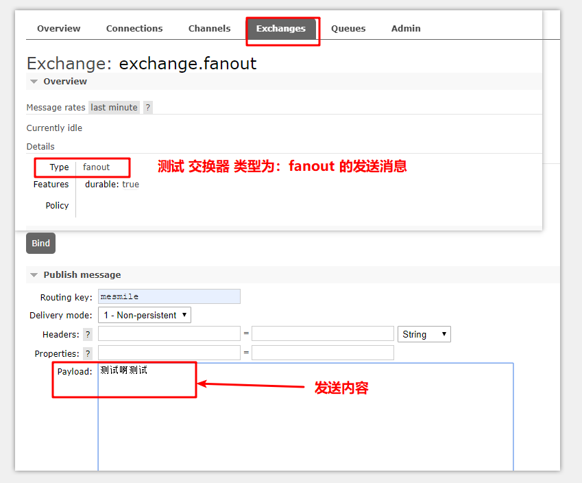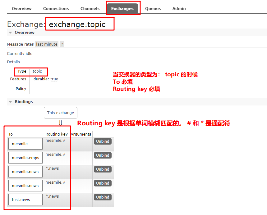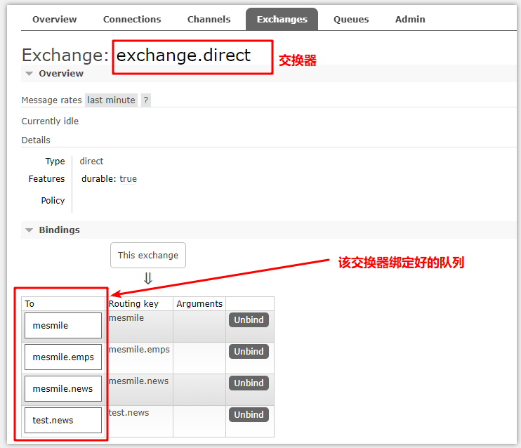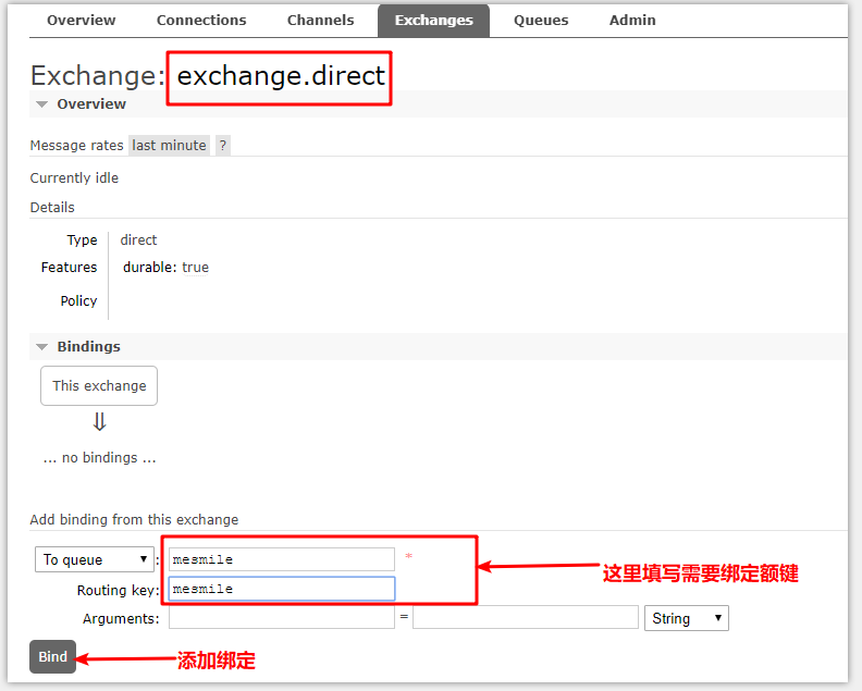 注意:当交换器类型为 direct 的时候,在绑定 队列的时候, To quene 和 Routing key 所填写的值必须一致