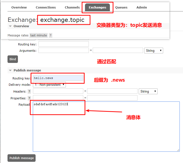 // 发送消息 exchange交换器,routingKey路由件,message消息头