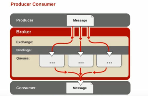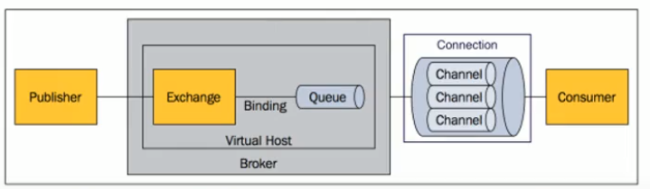 - AMQP 中消息的路由过程和lava 开发者熟悉的JMS存在一些差别,AMQP中增加了Exchange和Binding 的角色。生产者把消息发布到Exchange上,消息最终到达队列并被消费者接收,而Binding决定交换器的消息应该发送到那个队列。