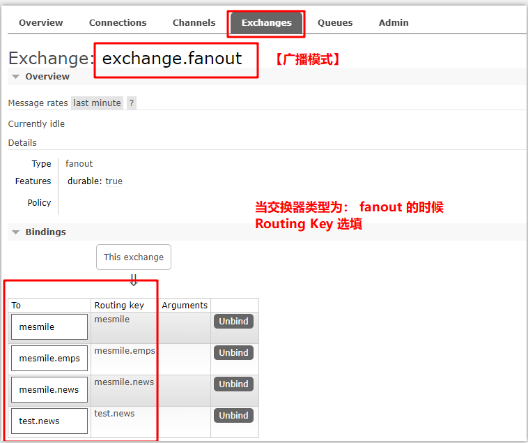 当交换器类型为 fanout 的时候,在绑定队列的时候 Routing key 选填
