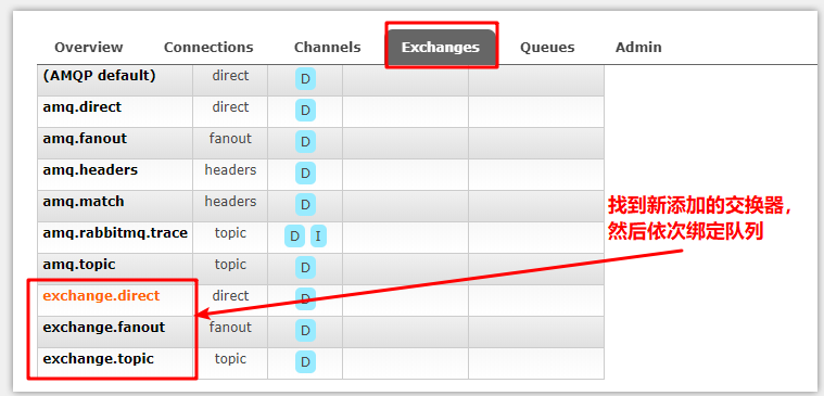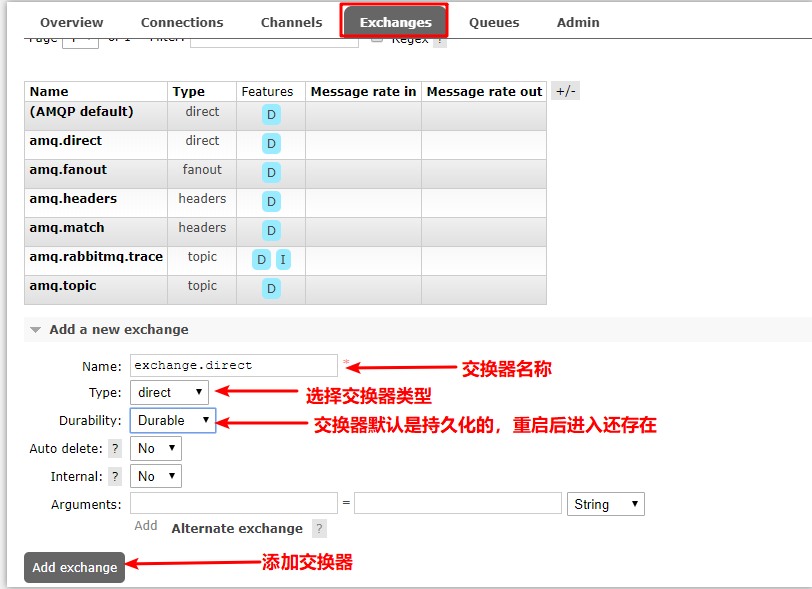 - 进入RabbitMQ web端的管理后台,添加交换器: