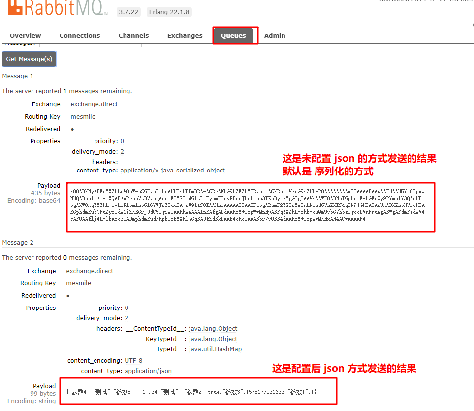 下面是 默认的序列化的方式和 json 的方式发送数据到 队列后,对比