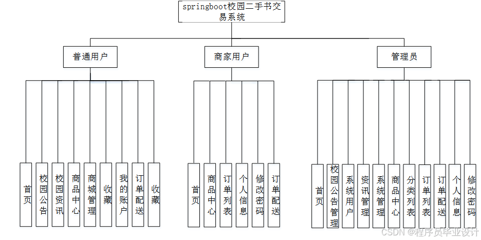 按照校园二手书交易系统的角色,我划分为了普通用户模块、商家用户模块及管理员管理模块这三大部分。