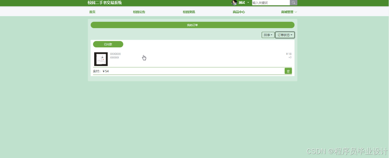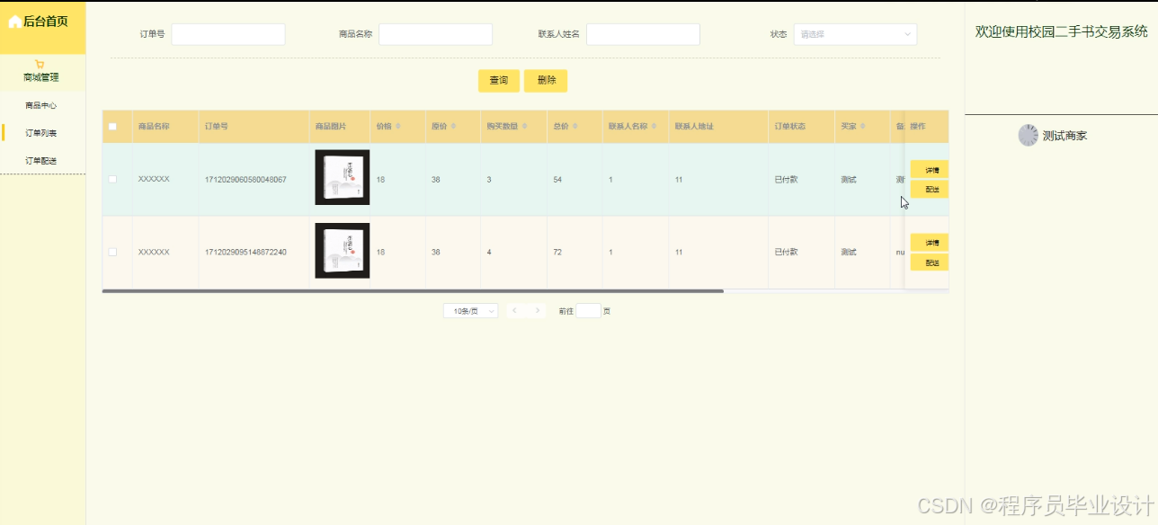 校园二手书交易系统中的商户是可以对校园二手书交易系统内的订单进行管控。订单列表界面如下图4-11所示。