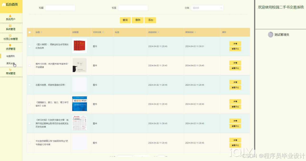 (2)资源管理:进入后台首页工具栏点击“资源管理”这个按钮可以查看所有校园资讯、资讯分类等信息,可以进行详情查看、删除、查看评论等操作。