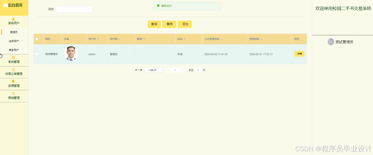 校园二手书交易系统中的管理人员是可以对前台注册的用户进行管理的,也可以对管理员进行管控。界面如下图4-7所示。