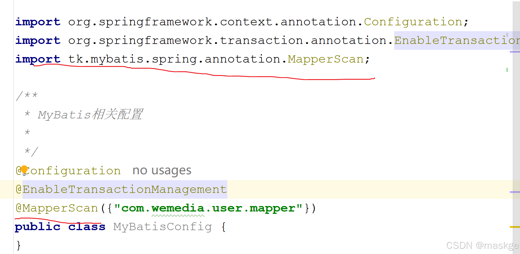 异常原因分析:由于 MyBatis 通用 Mapper 初始化失败导致的,经检查是因为导入的 @MapperScan 配置的注解引入的包错误,正确的应该是: