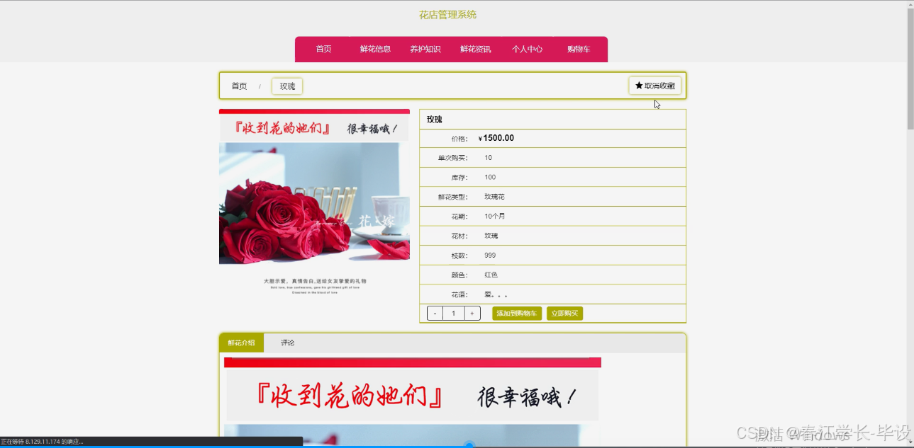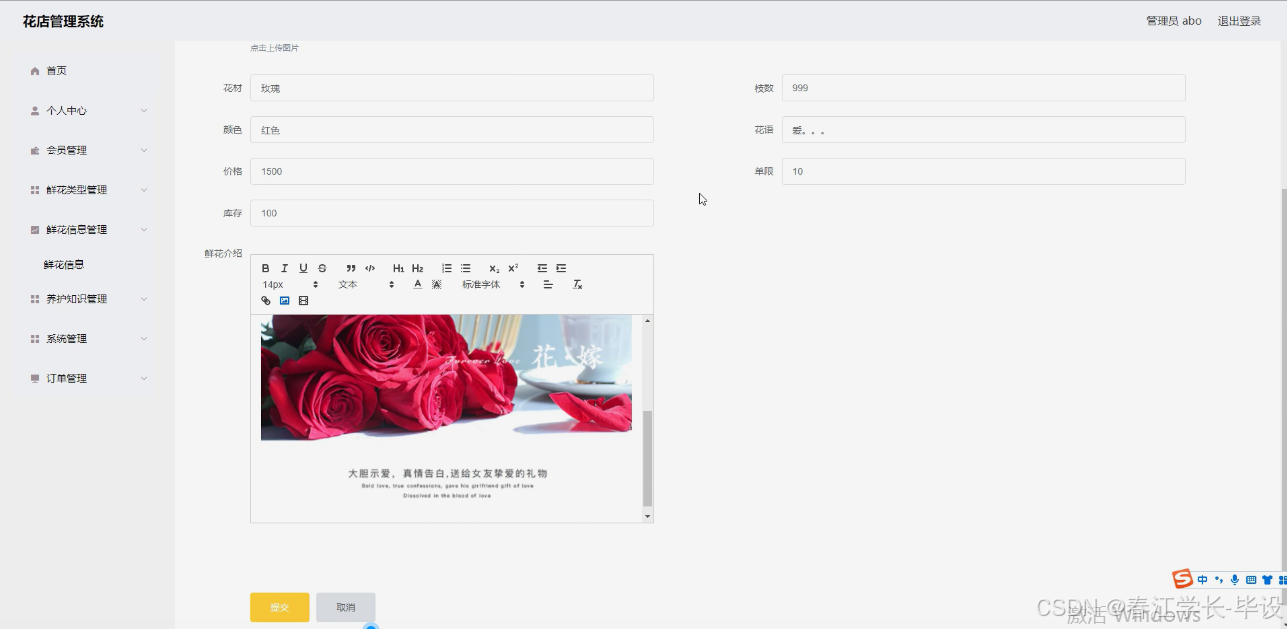 本研究旨在设计并实现一套功能完备的花店管理系统,以提升花店的管理水平与顾客服务质量。通过该系统,花店能够高效管理会员信息、鲜花类型与库存、预订情况等关键数据,同时为顾客提供便捷的鲜花查询、预订及养护知识服务,最终实现花店业务的数字化、智能化转型。