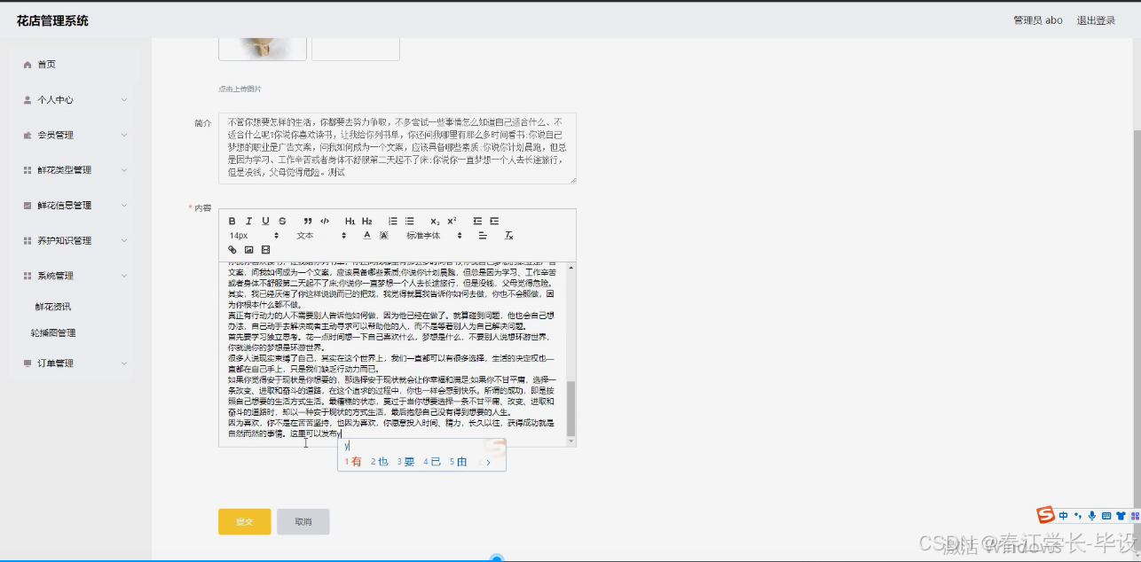 本系统主要包括会员管理、鲜花类型管理、鲜花信息管理、养护知识展示以及鲜花预订等核心功能。会员管理模块将实现会员信息的录入、查询与编辑,为花店提供精准的会员数据分析;鲜花类型与信息管理模块将分类展示各类鲜花,包括名称、价格、库存等详细信息,便于花店进行库存管理与顾客查询;养护知识展示模块将提供鲜花的养护技巧与注意事项,增强顾客的购物体验;鲜花预订模块则支持顾客在线预订鲜花,实现订单的快速处理与跟踪。通过整合这些功能,系统将全面满足花店的管理与顾客服务需求。