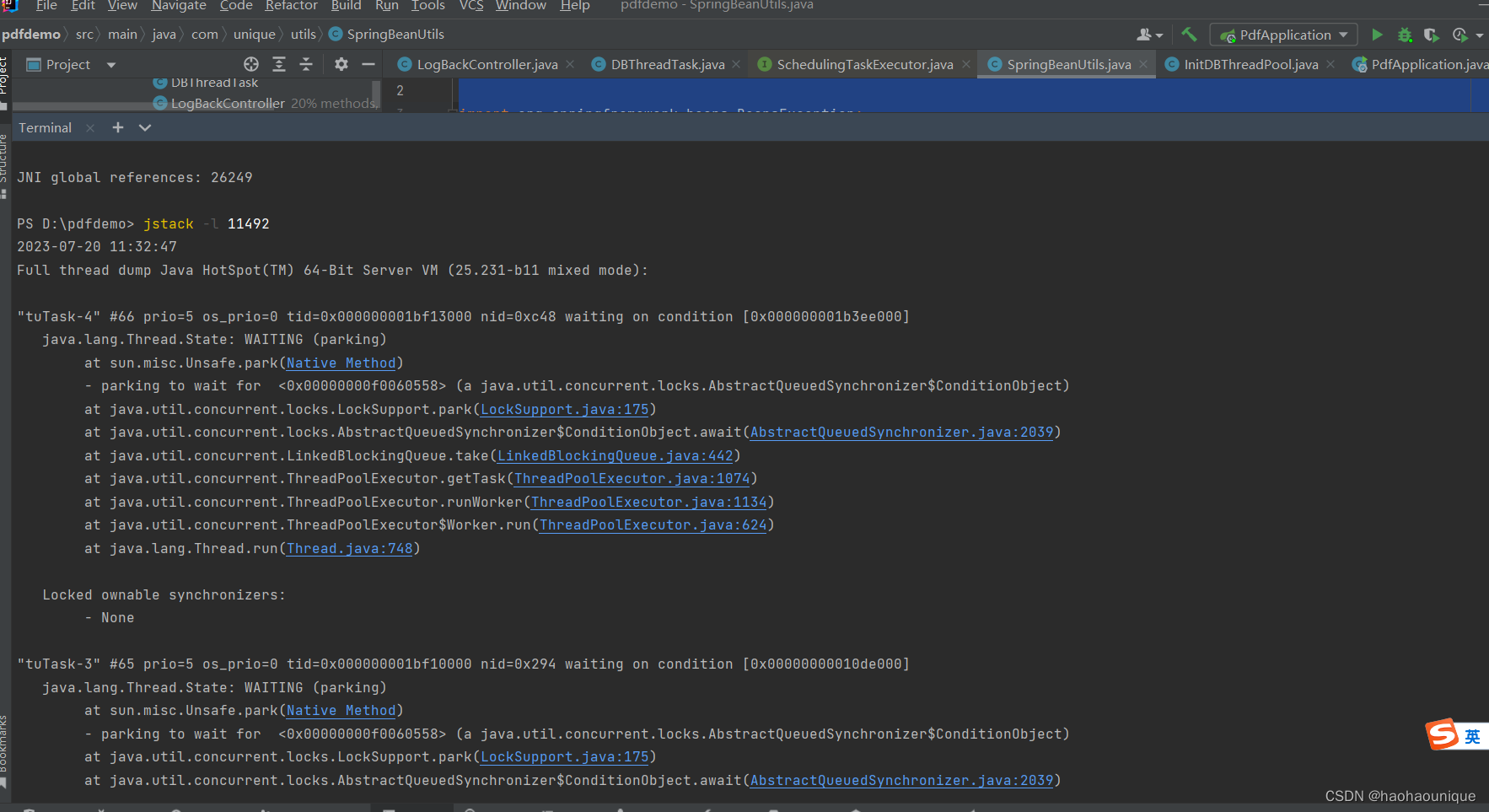 ThreadPoolTaskExecutor tuTask = (ThreadPoolTaskExecutor) springBeanUtils.getBean("tuTask");