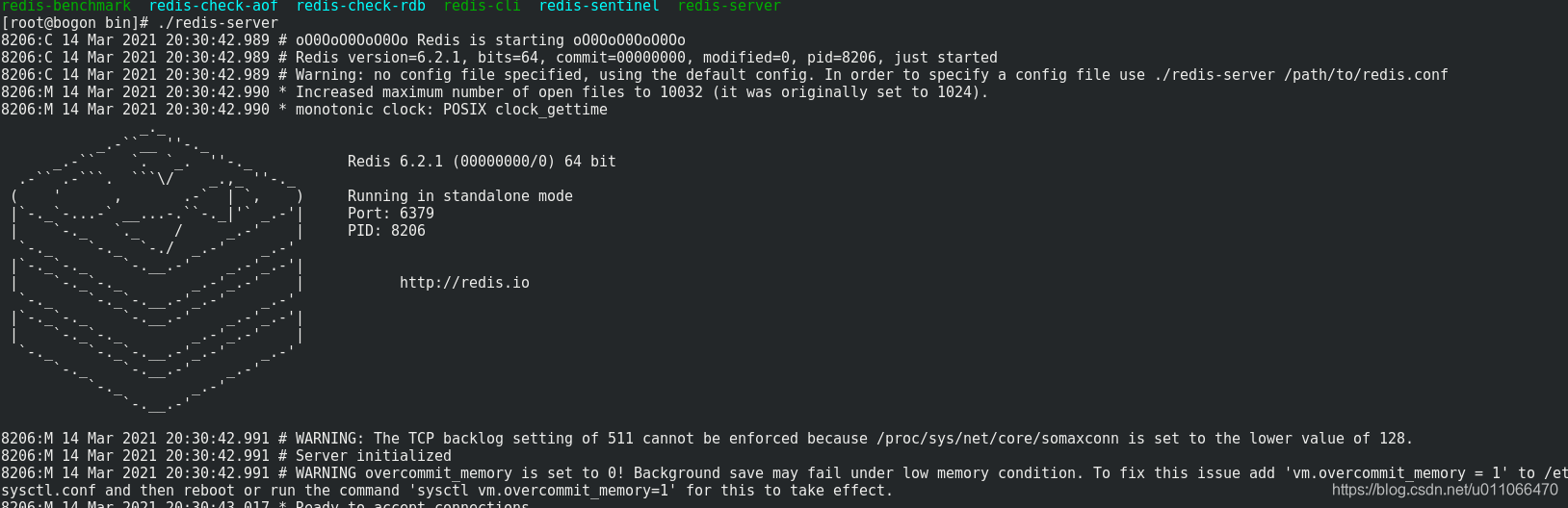 [root@bogon bin]# ./redis-server /bonc-kecheng-jingxiang/redis-6.2.1/redis.conf