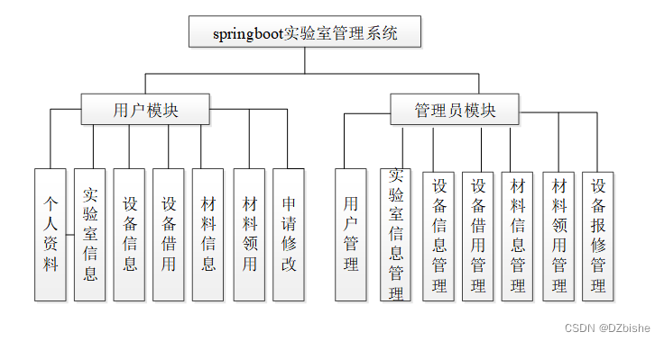 实验室管理系统在对需求做解析后,整个系统主要分为两个部分:管理员和用户,每个模块下的分支功能不一样。对功能做出如下说明: