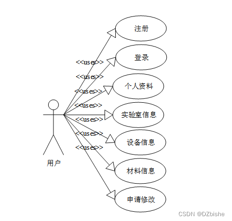 用户模块:账号注册。账号登录认证。管理个人资料信息,修改可修改的信息项。实验室信息:用户可以点击预约实验室,预约时间,结束时间。设备信息:用户可以点击查看各类设备信息。设备借用:用户可以点击借用设备。材料信息:用户可以查询材料信息,点击领用材料功能。管理员模块:个人资料:修改个人信息,修改密码。用户管理:可以查询,新增,修改和删除用户信息。实验室信息管理:查看实验室信息,实验室负责人姓名,电话,实