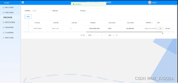 (5)申请记录管理:可以查看到学生用户提交的申请记录,可通过web端直接为其查询、添加、删除等操作;