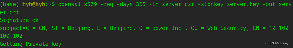 openssl x509 -req -days 365 -in server.csr -signkey server.key -out server.crt