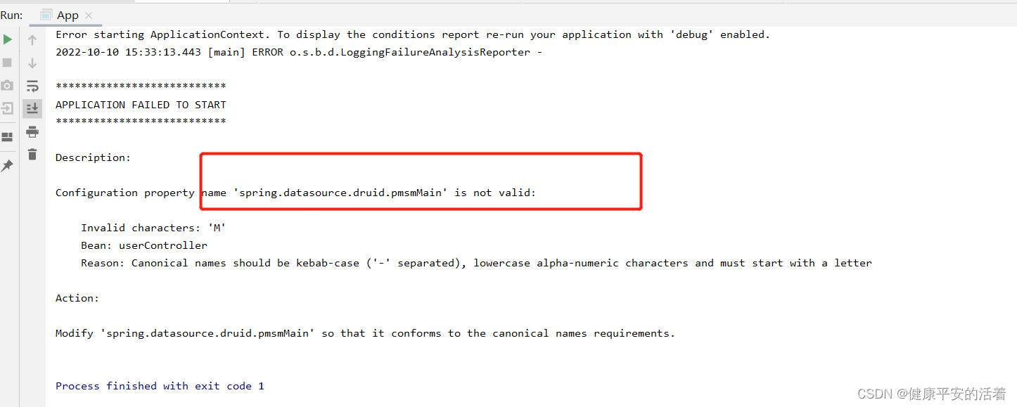 配置文件:spring:druid:pmsm-Main:#数据源1获取配置信息:结果启动报错原因在于:spring boot 2.x 中对配置文件中名称的命名规范进行了强制约束,需要使用kebab格式,不能使用java中的驼峰式写法了,分隔符使用 ’-‘ 来分隔。了解一下:kebabcase的规则。