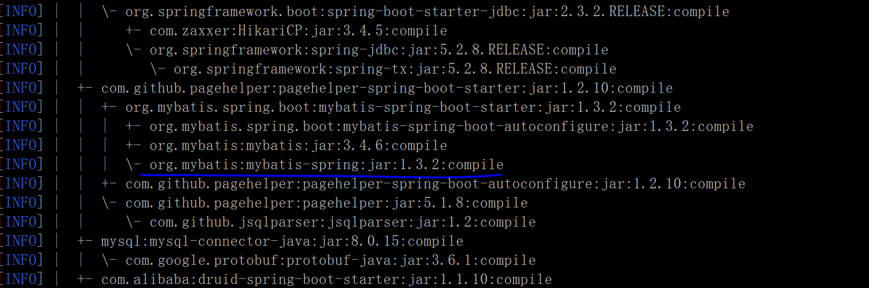 这时候发现自己引用的mybatis-spring 是1.3.2版本的 ,可是自己没有在项目中引用任何mybatis-spring依赖,后来想到,该项目是分多模块的,这些模块都依赖于一个父项目,这个父项目只用来声明依赖,其中就包括mybatis和mybatis-spring,删除父项目中的mybatis-spring依赖或者将该依赖升级到2.0.0就成功解决问题了。