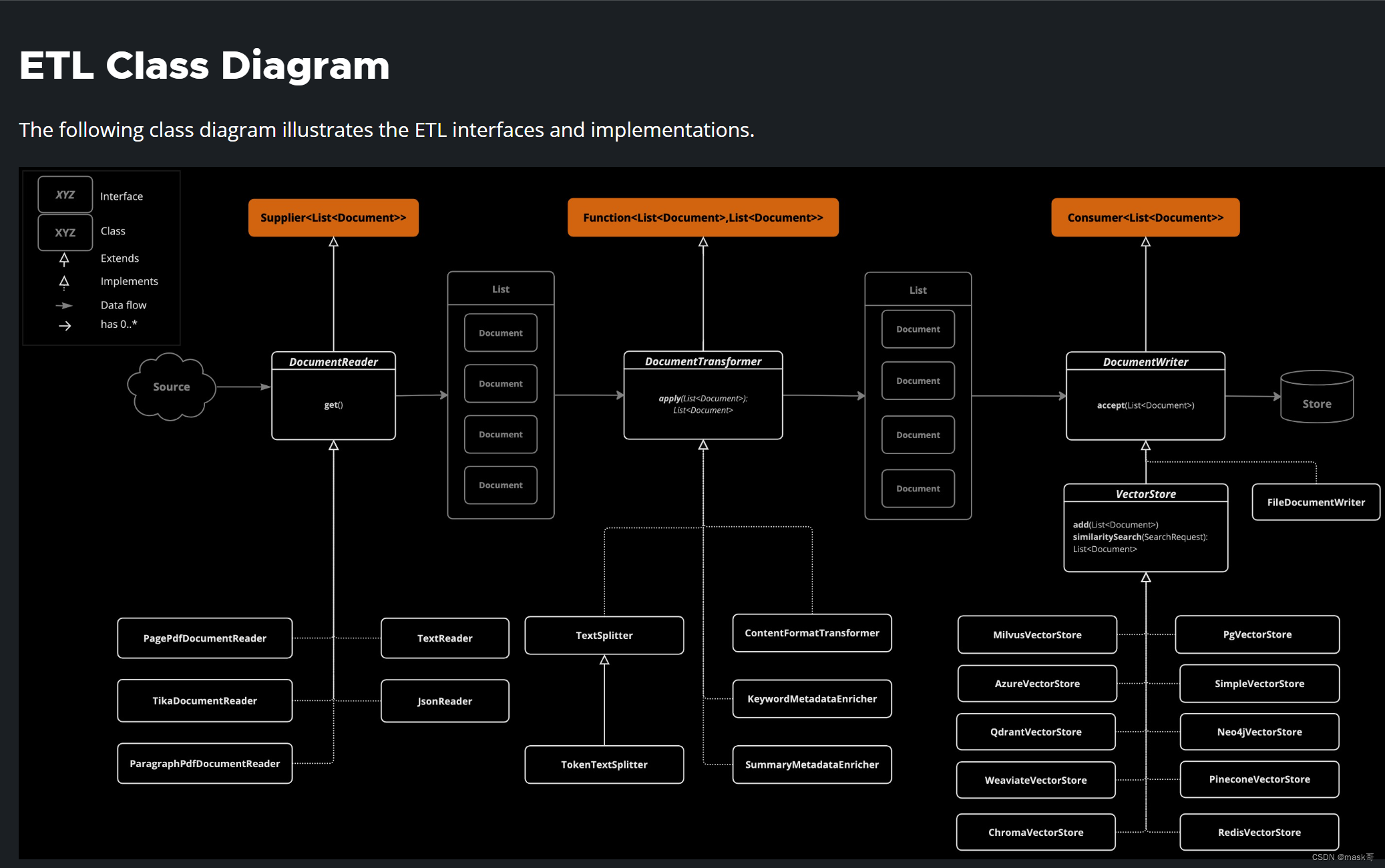 核心功能是促进使用向量存储将文档传输到模型提供者。 ETL 框架基于 Java 函数式编程概念,可帮助您将多个步骤链接在一起。