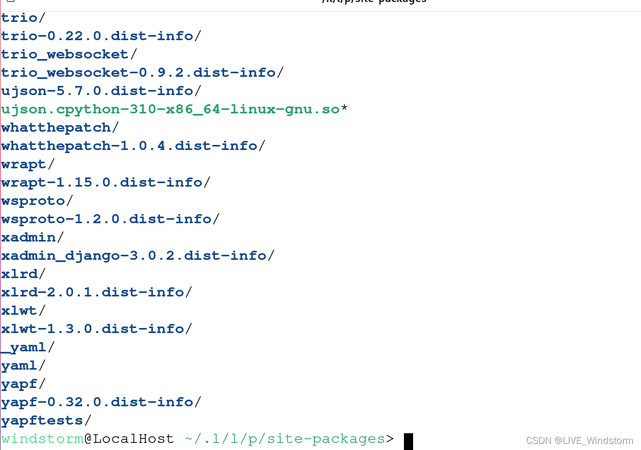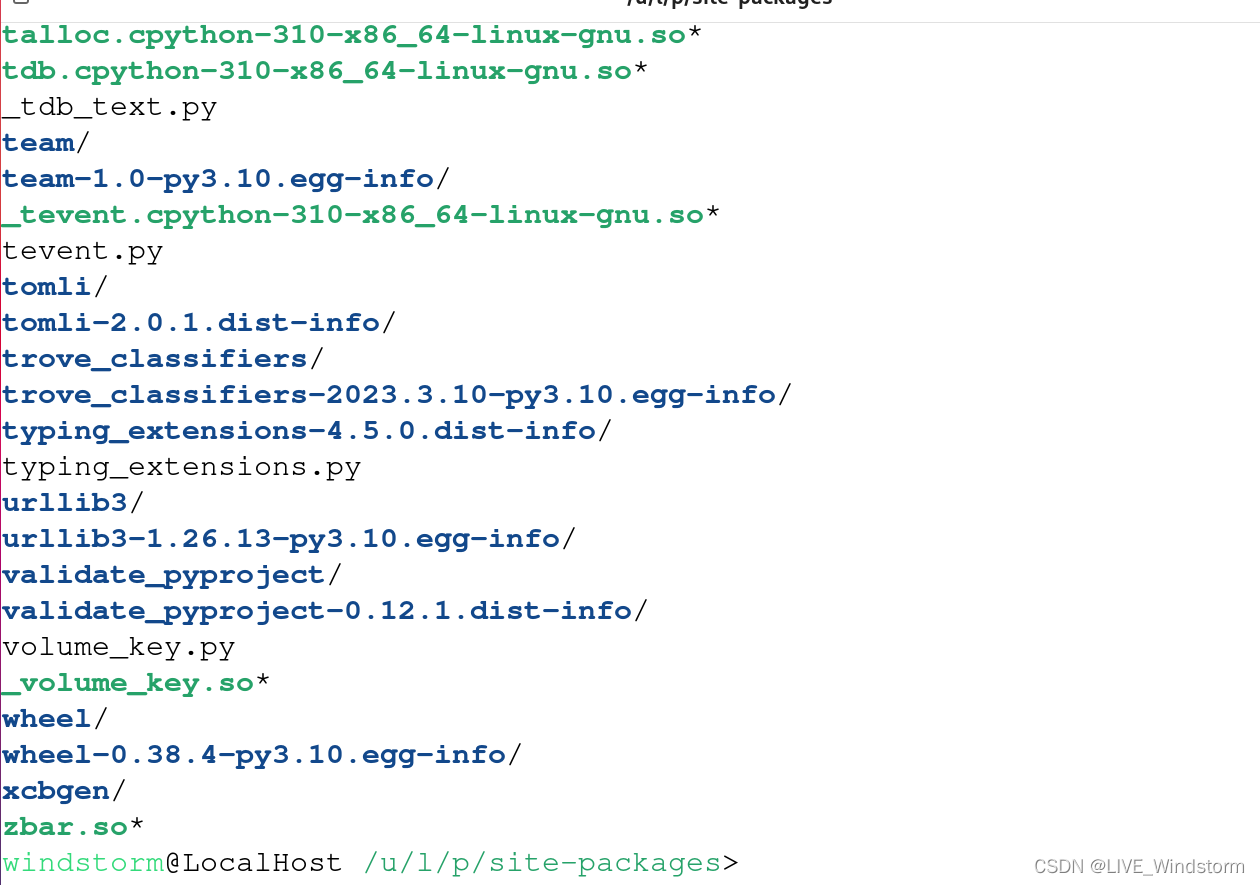 如果我们想要删除这些软件包,我们需要使用pip包管理工具来删除这些包,我们不能手动的使用rm指令来删除这些软件包,否则会出现问题。如果是系统管理员用户(比如:root)使用pip安装的包一般会放在这个目录下。1. 如果是普通用户安装的包,一般会放在这个目录下。