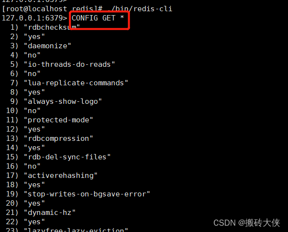 也可以通过redis-cli命令进入redis控制台后通过CONFIG GET * 的方式读取所有配置项。 如下: