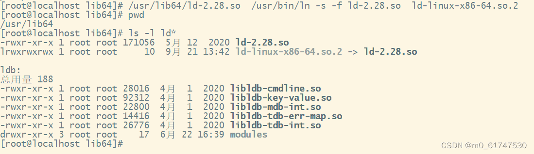[root@localhost lib64]# ln -s -f ld-2.28.so ld-linux-x86-64.so.2