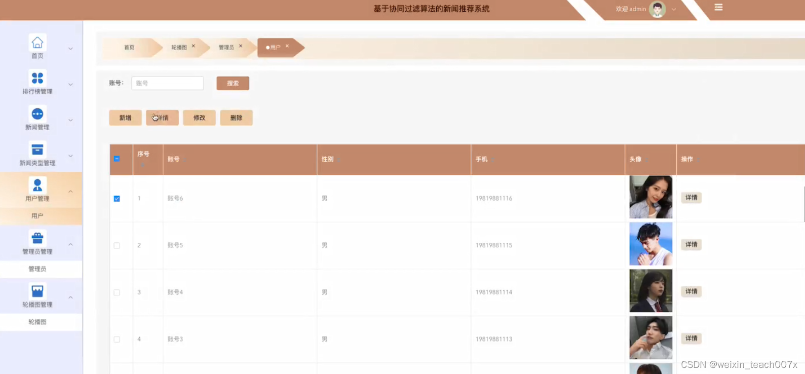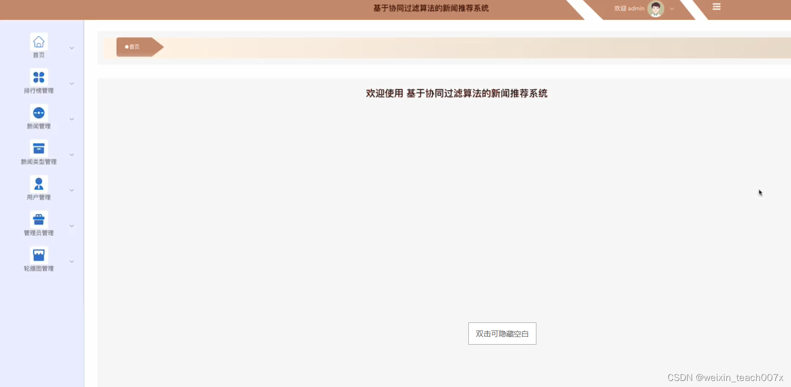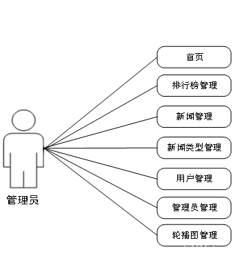 管理员进入主页面,主要功能包括对首页、排行榜管理、新闻管理、新闻类型管理、用户管理、管理员管理、轮播图管理等进行操作。管理员主页面如图5-8所示: