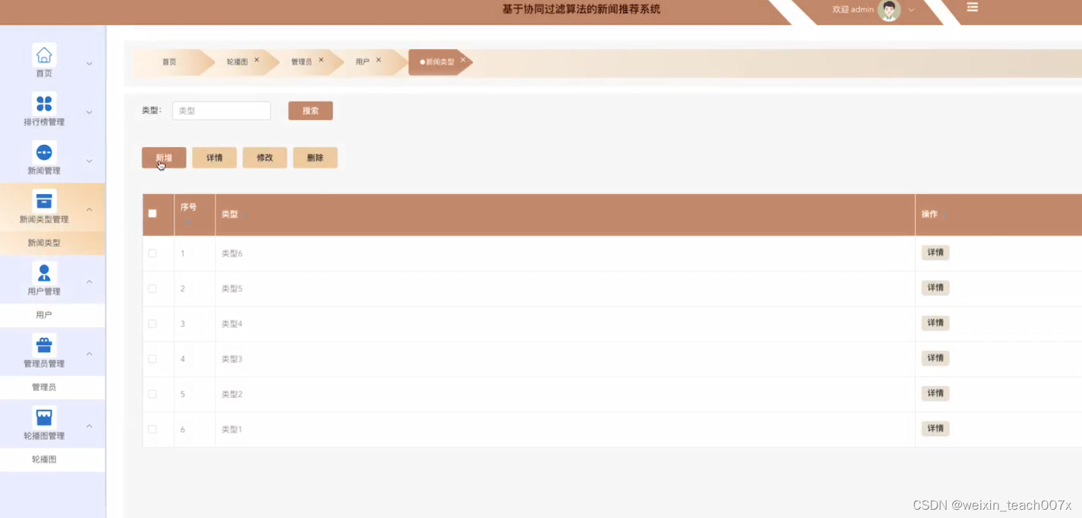 新闻类型功能在视图层(view层)进行交互,比如点击“新增”按钮或填写新闻类型表单。这些新闻类型动作被视图层捕获并作为请求发送给相应的控制器层(control1er层)。控制器接收到这些请求后,调用服务层(service层)以执行相关的业务逻辑,例如验证输入数据的有效性和与数据库的交互。服务层处理完这些逻辑后,进一步与数据访问对象层(DAO层)交互,后者负责具体的数据操作如搜索、新增、修改或删除新闻类型,并将操作结果返回给控制器。最终,控制器根据这些结果更新视图层,以便新闻类型功能可以看到最新的信息或相应的操作反馈。在新闻类型页面的输入栏中输入新闻类型进行搜索,可以查看到新闻类型详细信息,并根据需要进行修改或者删除等操作。如图5-10所示: