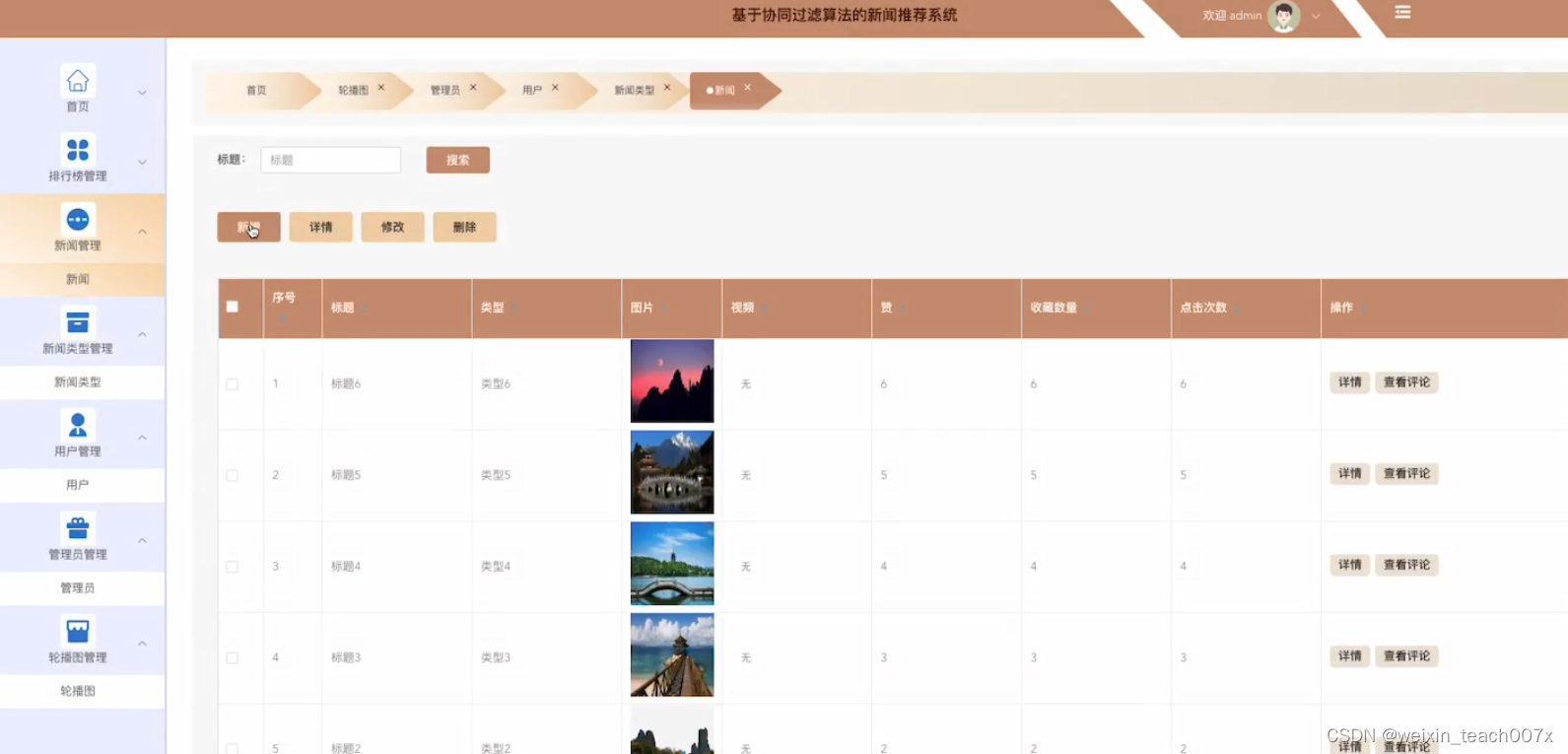 管理员点击新闻,在新闻页面对标题、类型、图片、视频、赞、收藏数量、点击次数等信息,可以搜索或删除新闻等操作。如图5-12所示: