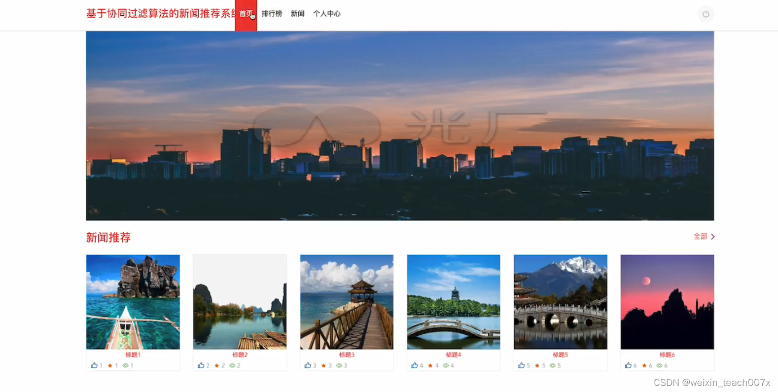 当游客打开系统的网址后,首先看到的就是首页界面。在这里,游客能够看到新闻推荐系统的导航条显示首页、排行榜、新闻、个人中心。系统首页界面如图5-1所示: