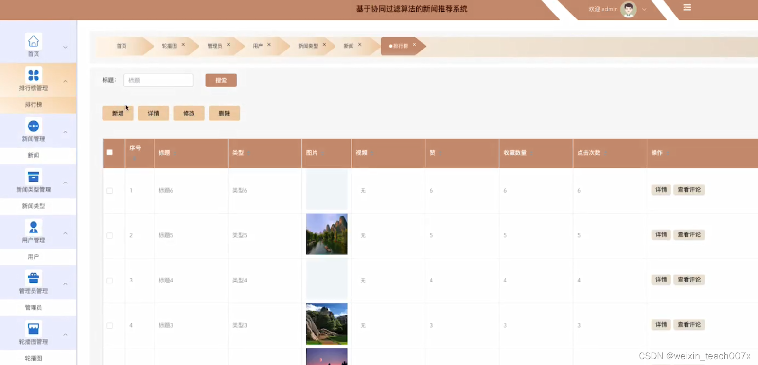 管理员点击排行榜,在排行榜页面对标题、类型、图片、视频、赞、收藏数量、点击次数等信息,可以搜索、新增或删除排行榜等操作。如图5-13所示: