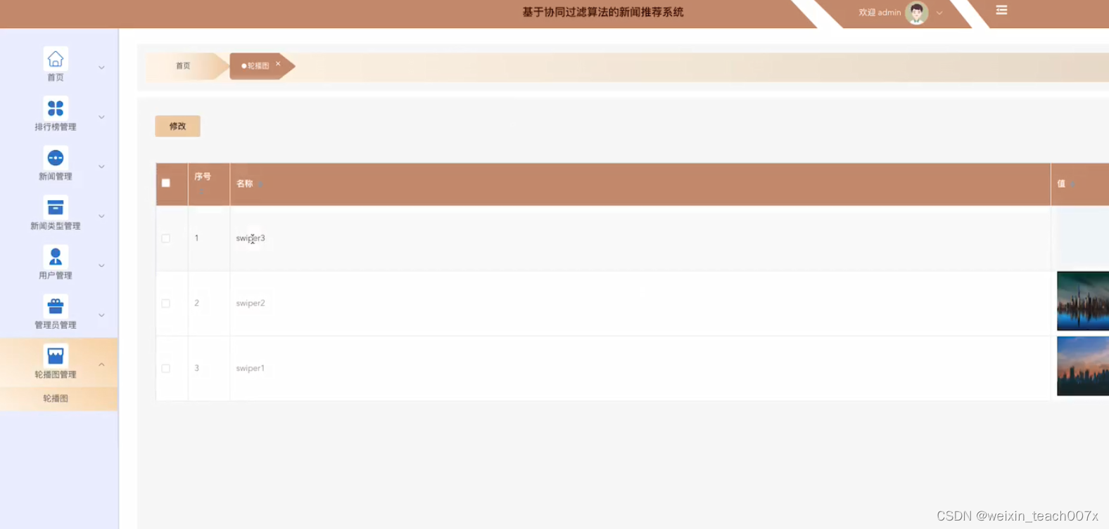 管理员点击轮播图,在轮播图页面输入名称、值等信息,可以修改轮播图等操作。如图5-11所示: