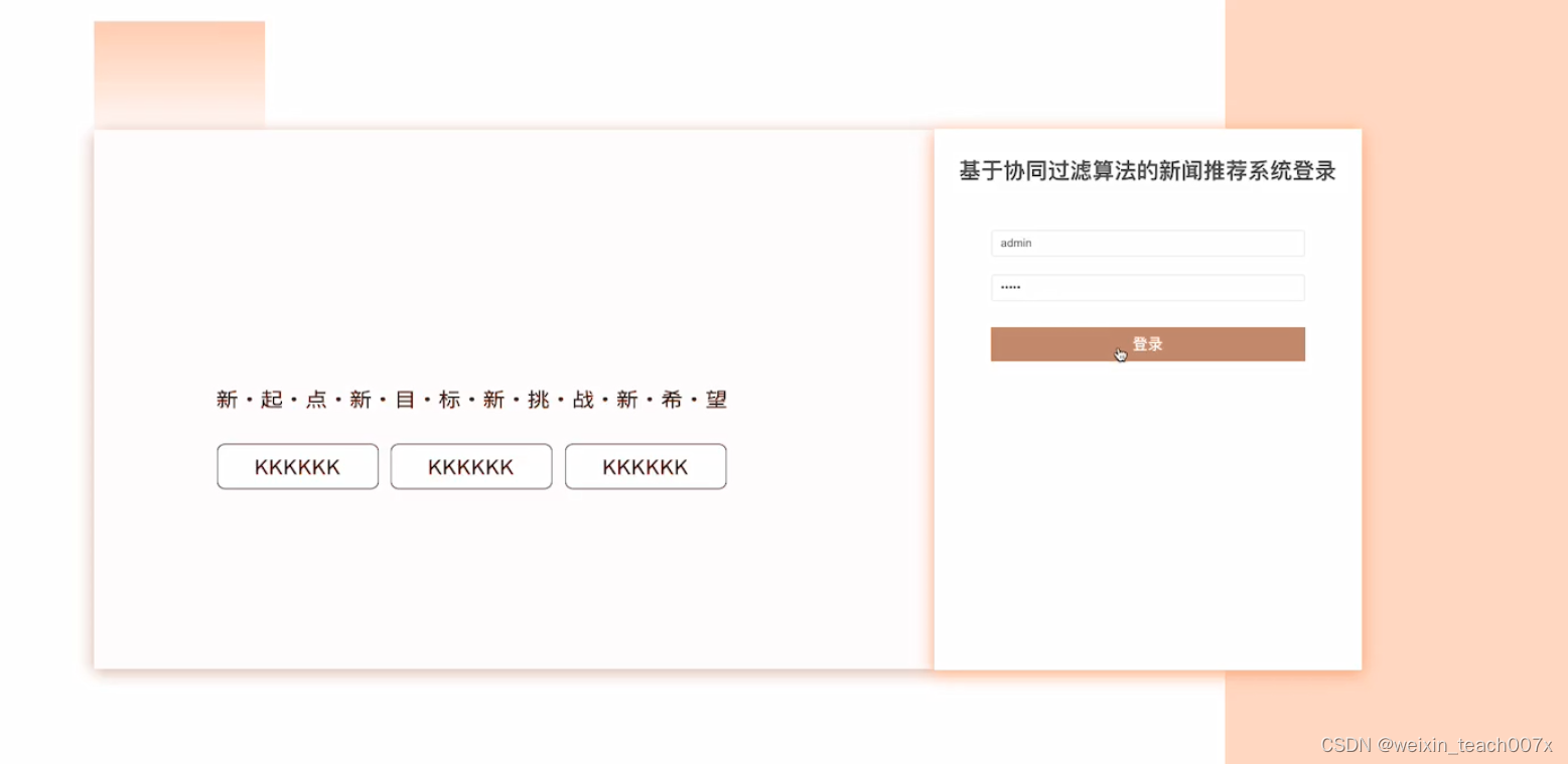 本模块主要是使用者可以通过新闻推荐系统的首页进入该系统。用户输入正确的账号名和密码,一旦输入信息有错,将在系统显示错误提示,同时严禁系统用户做出其他动作。如果注册信息正确无误,系统就会按照使用者的身份信息做出有关权利的判定,用户进入前台系统,管理者则进入后台系统。管理员登录主页面如图5-7所示: