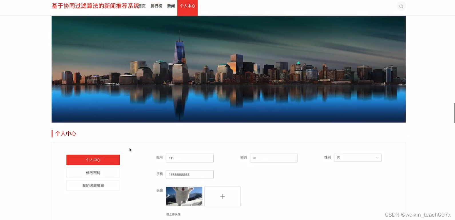 用户点击个人中心,在个人中心页面可以修改个人信息,还可以对修改密码、我的收藏管理进行详细操作,如图5-6所示。