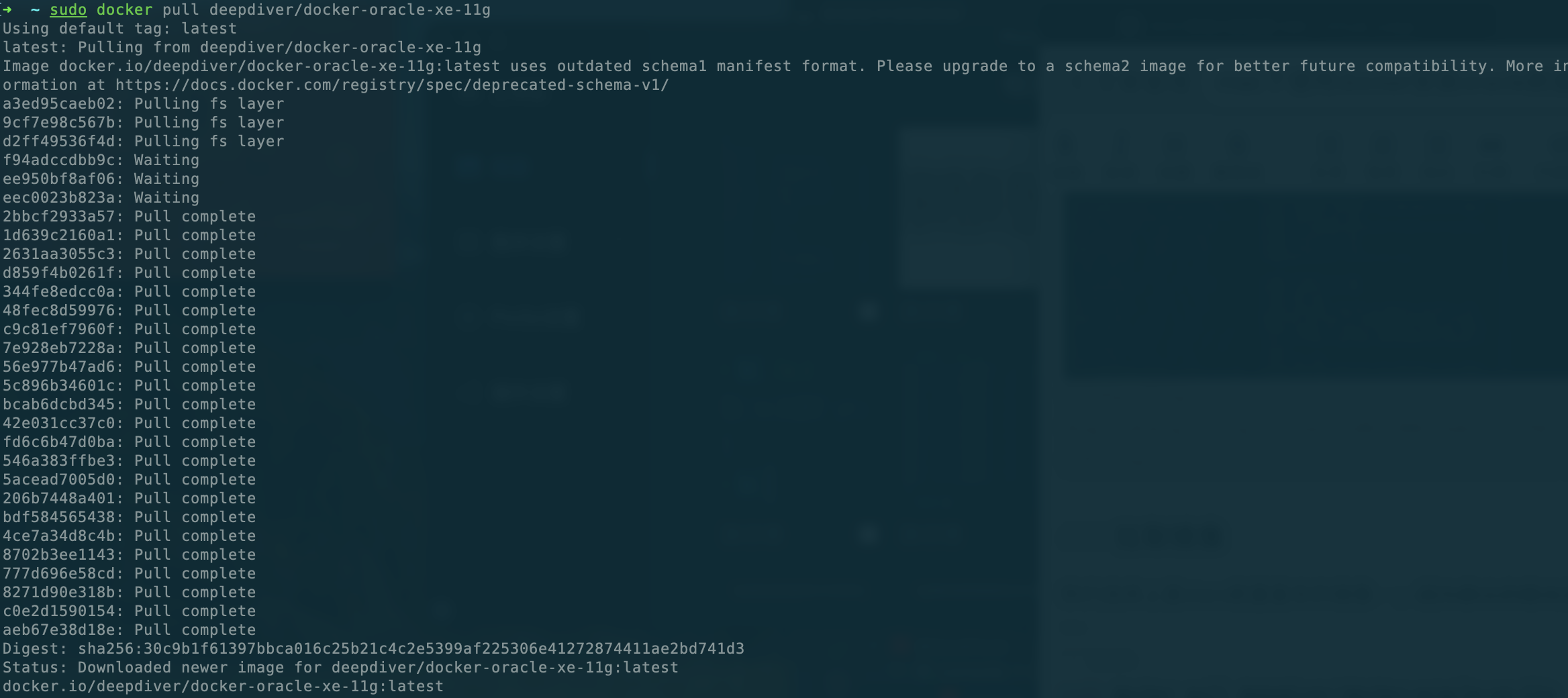sudo docker pull deepdiver/docker-oracle-xe-11g