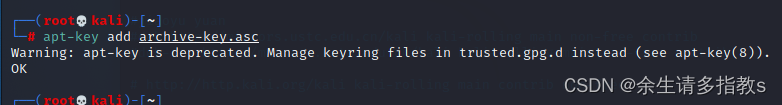 安装完kali lnux后,把系统默认使用的是kali官方源,相较于kali官方源,国内源更为方便快捷。输入apt-key add archive-key.asc,然后回车,发现出现ok就说明数字签名已经添加好了。wget archive.kali.org/archive-key.asc,然后会车。最后再重新更新一下源就可以了。