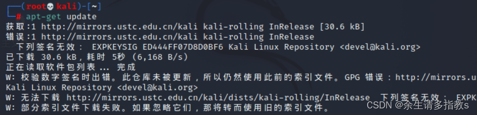 安装完kali lnux后,把系统默认使用的是kali官方源,相较于kali官方源,国内源更为方便快捷。但是,很多小伙伴在将kali官方源更换为国内源后使用apt-get update命令更新源时出现报错,具体为下图: