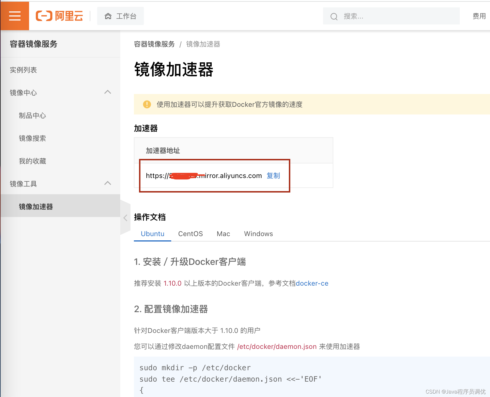 (https://cr.console.aliyun.com/#/accelerator):这部分不清楚可以自行查阅如何获得镜像加速器地址等问题,红框内为可用镜像加速器地址,之后会用到。