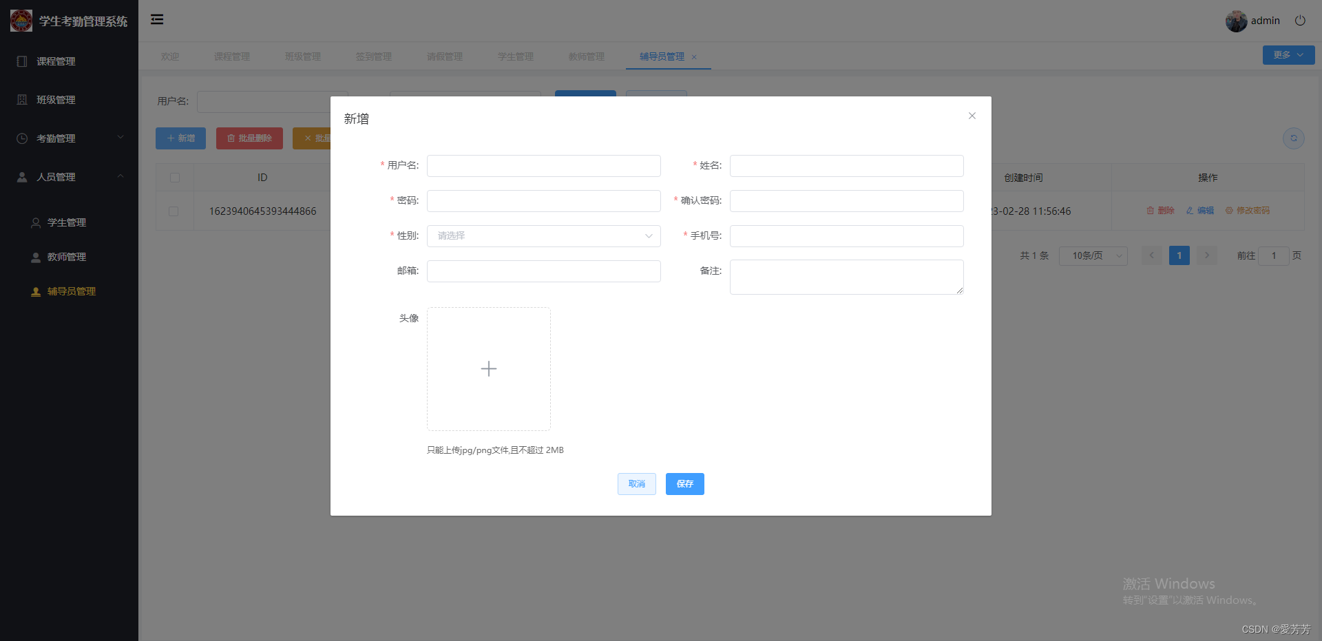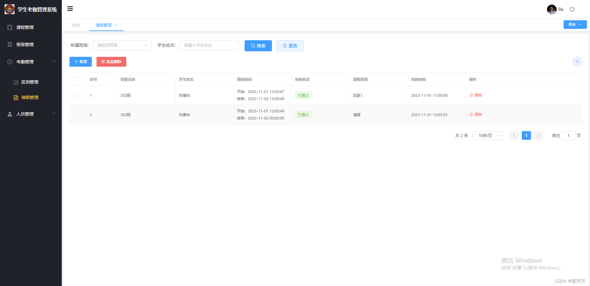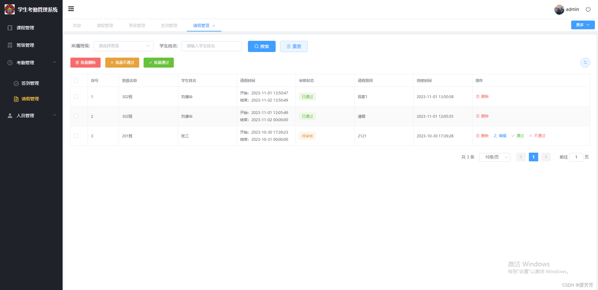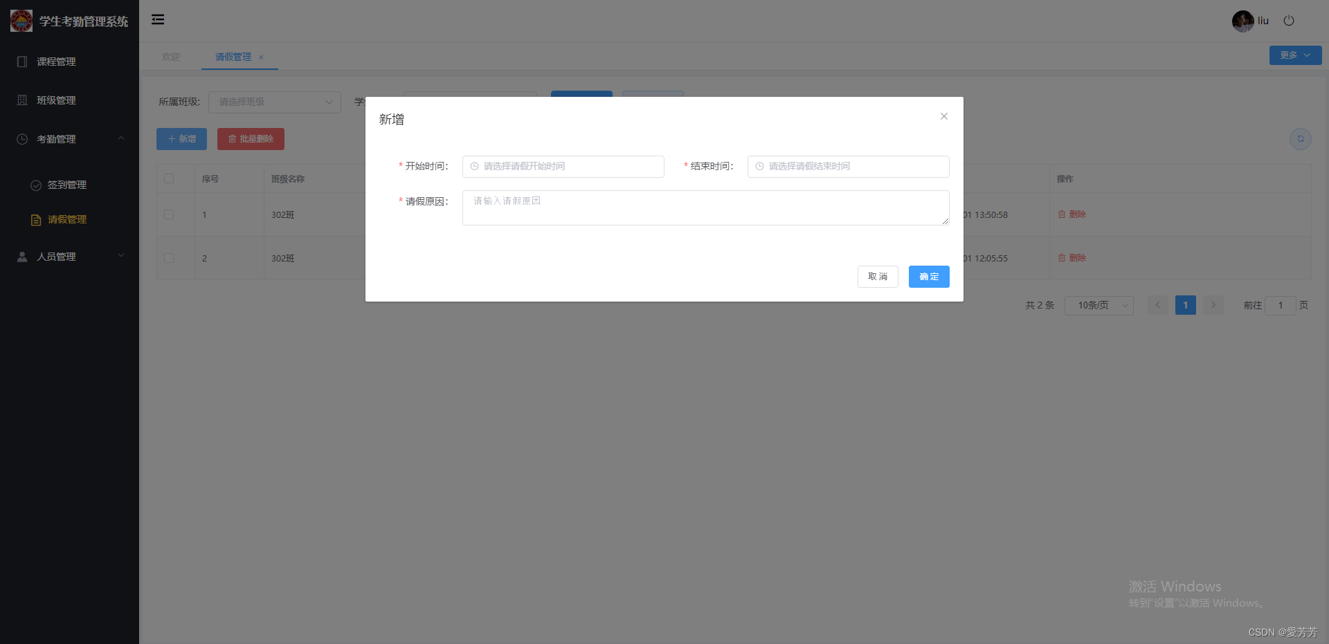 请假只能由学生进行添加,辅导员拥有除了新增权限外的所有权限,教师只能对所授课班级学生的请假记录进行管理,学生只能对自己的请假记录进行管理和查看。