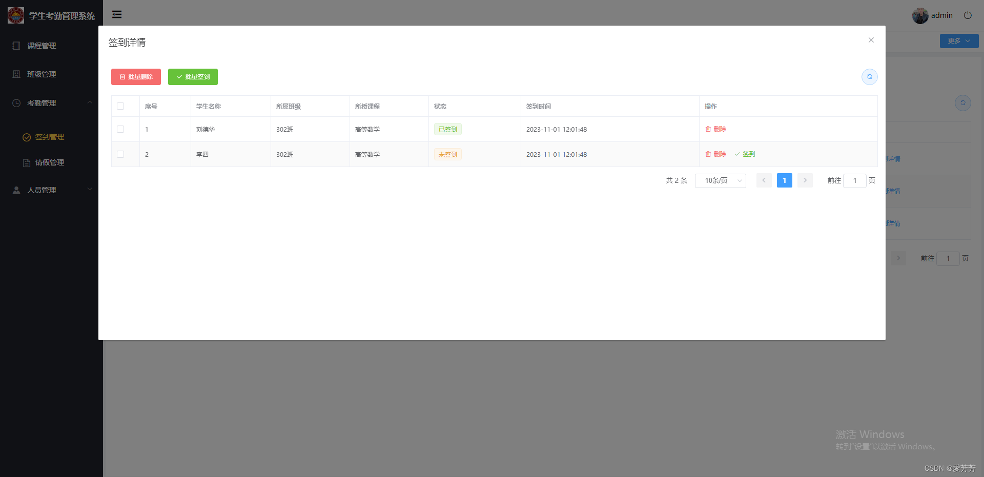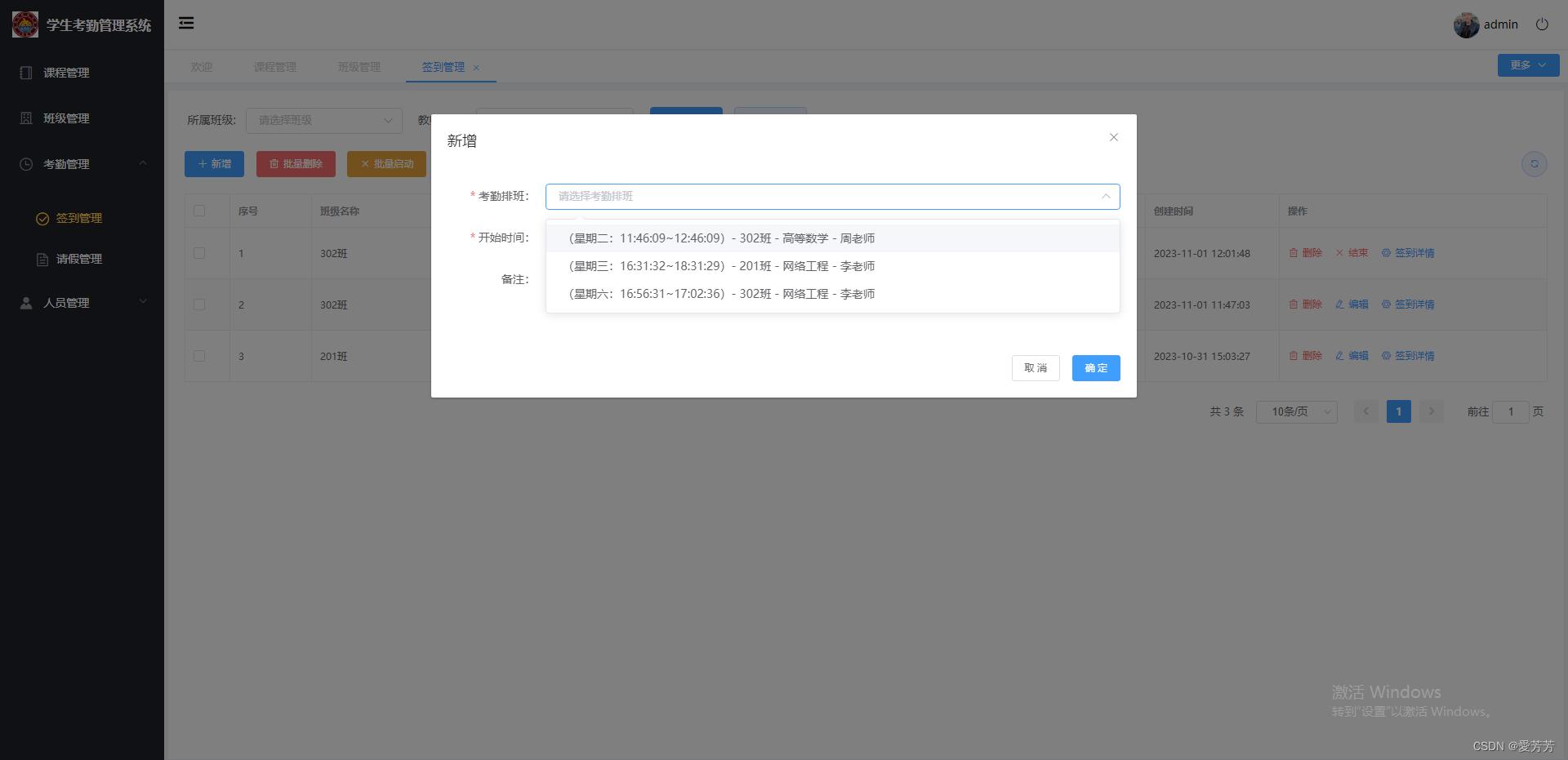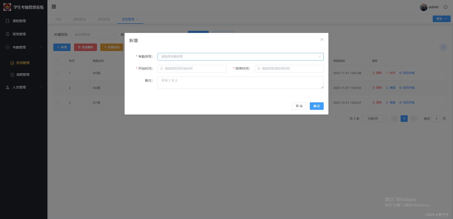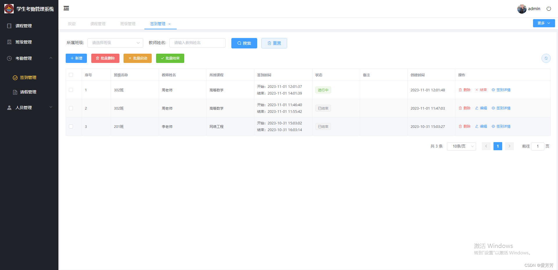 辅导员拥有全部权限,教师只能添加所授课程排班的签到和只能对自己的签到进行管理,学生只能对本班的签到进行查看。